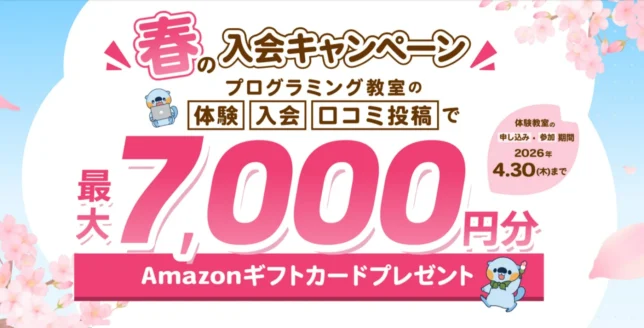 現在、プログラミング教室検索サイト「コエテコ by GMO」にて、春の体験・入会キャンペーンが実施されています。期間中にコエテコを経由して当教室の体験にお申し込みいただき、条件を満たすと、最大7,000円分のAmazonギフトカードがプレゼントされます。